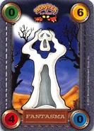 Ghost is a monster in the class "The Ghosts." It is monster #37. This version of the Ghost has stripped away the cartoony look for a more ghastly apparition, with sharp claws, spikes and red eyes, although still not looking quite human. It is visually similar to the 2006 Poltergeist, being made of a transparent plastic with a blue colour. It's overall trading card points total to 223 points. His background photo is a medieval styled spiral staircase.