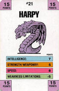Harpy is a monster in the class "The Winged." She is monster #20. Harpy appears as a ugly redheaded woman with an avian body. Unlike her Series 1 counterpart, this Harpy does not have any serpentine features. Her trading card points are worth 157. Her background photo is likely the Andes mountains, or a similar mountain range.