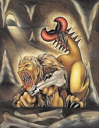 What do you feed a monster that is 12 feet long, has the body of the lion, the tail of a scorpion, and the head of a human with three rows of sharp teeth? Anything he wants of course! The ferocious, man-eating Manticore has powerful blue eyes and the voice of a trumpet, but don't expect to see him at your next rock concert. This "low life" lives deep beneath the desert, close to the center of the earth. The Manticore runs as swiftly as the deer, has the ability to leap over small buildings. He uses his tail to shoot poisonous, spine-like straws into his victims, through which he slurps their blood. This is not the kind of guy you would want your sister to marry...or then again maybe it is!