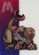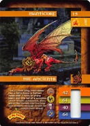 Manticore is a monster in the class "The Ancients." It is monster #15. Manticore now has a more leonine face, a lithe, red body, a scorpion's tail and bat-like wings. His total points on his trading card add up to 207. His background photo is set in a dark graveyard.
