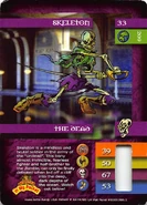 Skeleton is a monster in the class "The Dead" and is monster #33. He wears tattered clothing and holds on to a sword, looking very similar to an undead pirate. Skeleton was given a total points value of 203 on his collectable game card. Because of its thin structure, this figure requires a foot support on its left foot. Its background photo is inside some sort of tomb, potentially Middle Eastern styled. This is one of the very few figures that don't completely match up with their official artwork. The figurine itself, Skeleton is holding his sword in front of him while his artwork depicts him grabbing his sword with both hands from behind.