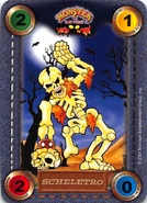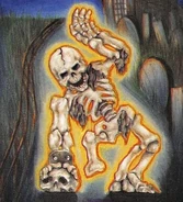 Although he died nearly 100 years ago, the Skeleton still lives on today. Tired of being used as worm food, this beastly bag of bones arose from the ground to menace the ancestors of those who put him to death. The Skeleton's bones are magically joined together with no muscles or skin. He possesses great speed and will not hesitate to pull off one of his arms or legs and use it as a club to attack his enemies. As you can see, this bonehead is not exactly a spineless wimp, (for then he'd be called chicken bones)! He's powerful and scary. You'd better hope he doesn't come shake, rattle, and rolling after you!