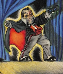 Phantom is a disfigured and creepy creature, that seems like a living skeleton. when he was a child he was so ugly that his mother to not see him covered his face with a bag. One day bought a mask and departed from home to become famous in the show business. Instead ended to live in the caverns below the Theater of the Opera of Paris. After many years of solitude and isolation he became mad. Phantom have fun to strangle people that bother him and to reverse melted wax over the public that disturb the play. Phantom has now abandoned Paris and is around theaters and cinemas terrorizing the audience.