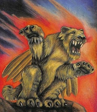 This "catbird" is not your ordinary monster. This deadly Winged Panther sports a pair of eagle's wings on his back. This enables him to hide in trees and pounce down upon his prey from the air. Although he normally limits his victims to unsuspecting sheep and cattle, this beast will not hesitate to attack humans who attempt to steal one of his feathers. For once a feather is removed from his wings, this "plucked plumage" turns into gold! This cat may have nine lives, but you've only got one - are you willing to risk it to put a very valuable feather in your cap?
